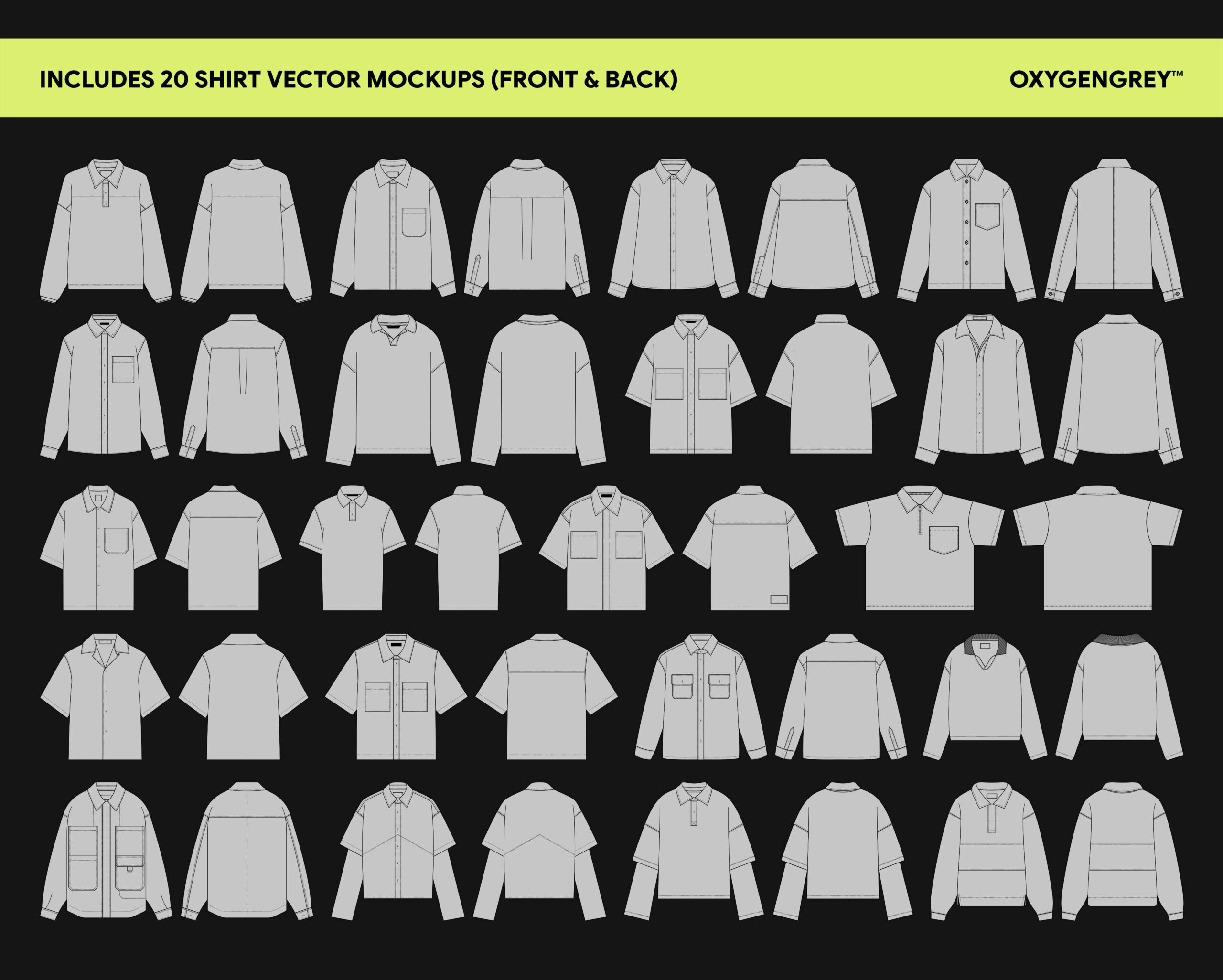 Shirt Vector Mockups (Vol.1) gives you 20 core templates built for manufacturing custom Shirts — covering a range of fits and styles for everyday and streetwear designs.