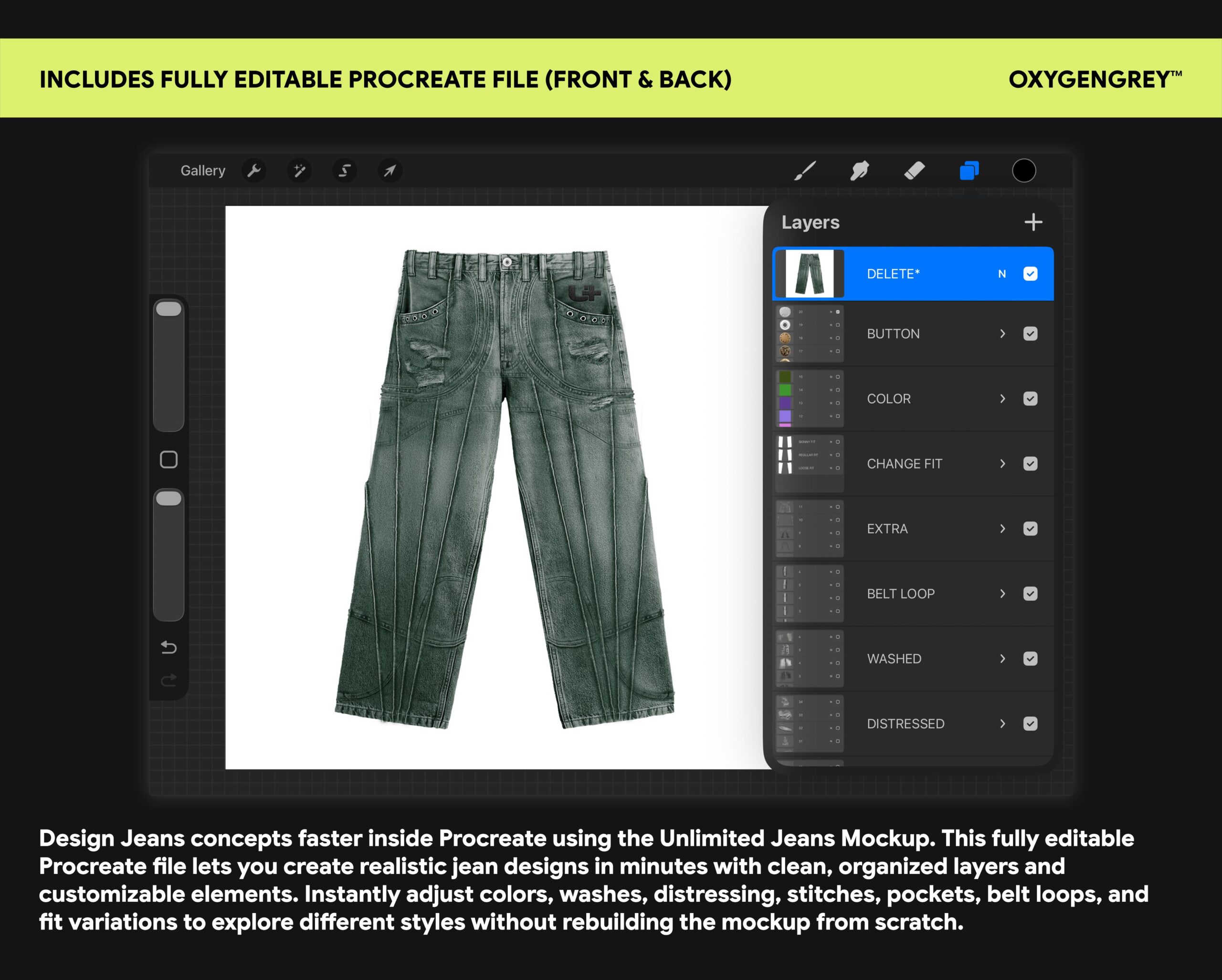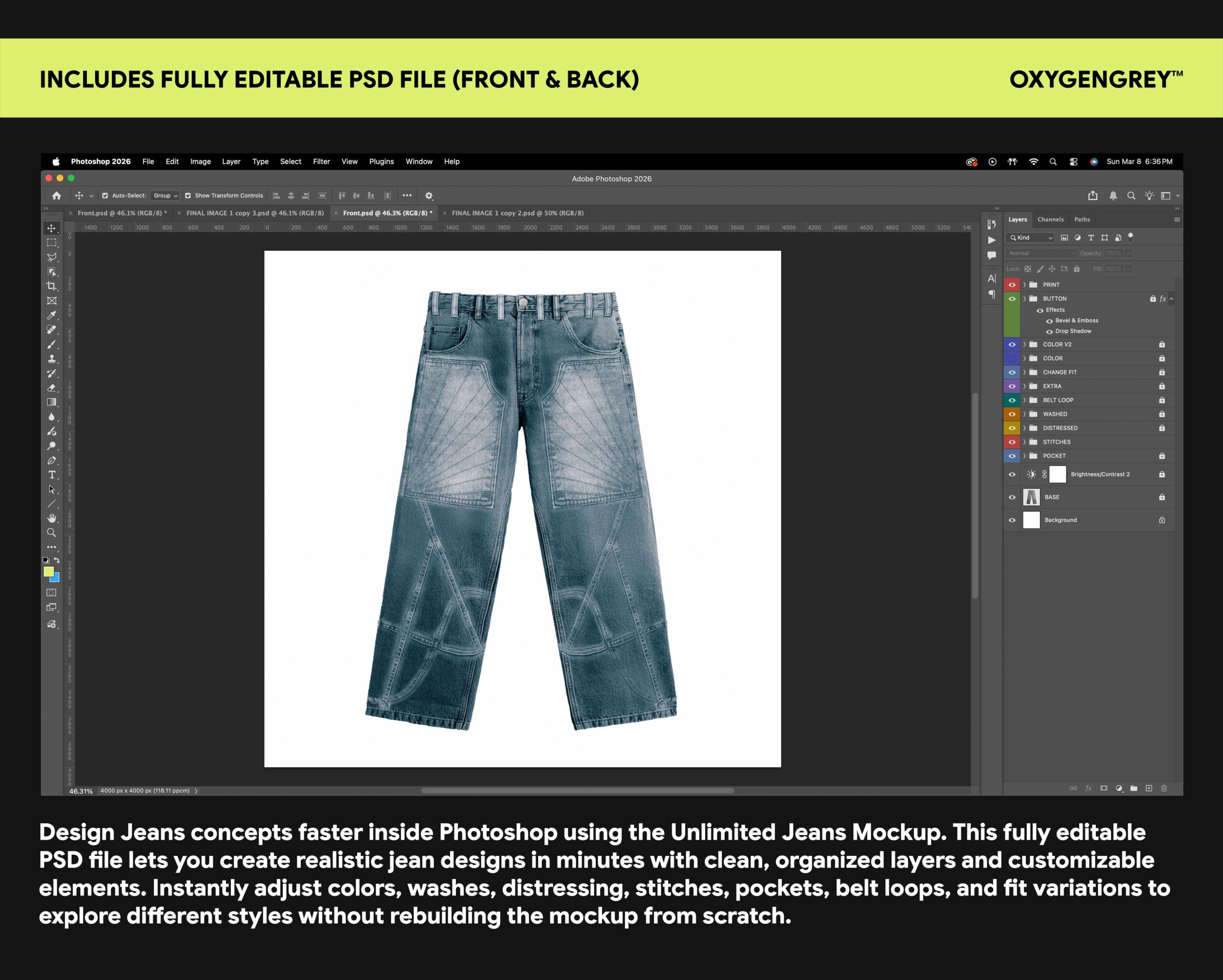 Inspired by real garment construction and denim detailing, every element of this mockup allows you to shape the jeans exactly the way you want. From washes and distressing to stitches, belt loops, pockets, and color variations, each part can be turned on, off, or modified to create unique combinations.